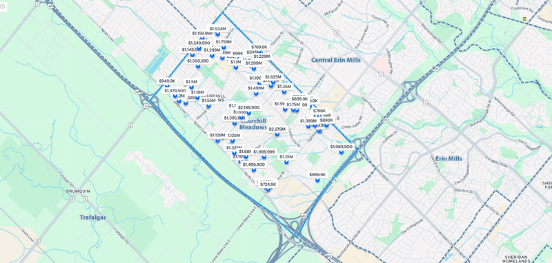 Churchill Meadows位于社区位于密西沙加的西部,403号高速公路以北,Brittania路以南。407号高速公路沿社区的西边界延伸,高速公路另一侧是包括奥克维尔和米尔顿镇在内的霍尔顿区。Churchill Meadows被认为是购房者的入门级社区。