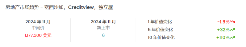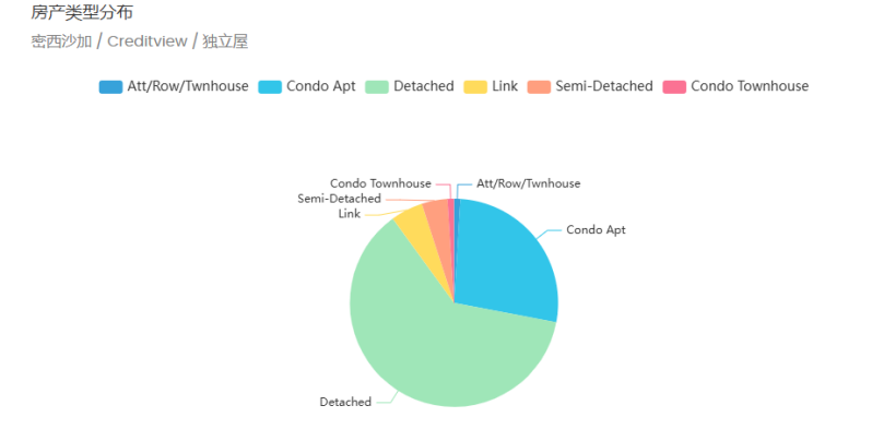 Creditview的房屋大多尺寸和风格统一,外墙为砖面,前面有单车库或双车库。社区内有联排别墅、半独立屋和独立屋。Erindale Go Station附近有几栋公寓楼,Burnhamthorpe路沿线目前正在进行新公寓开发。