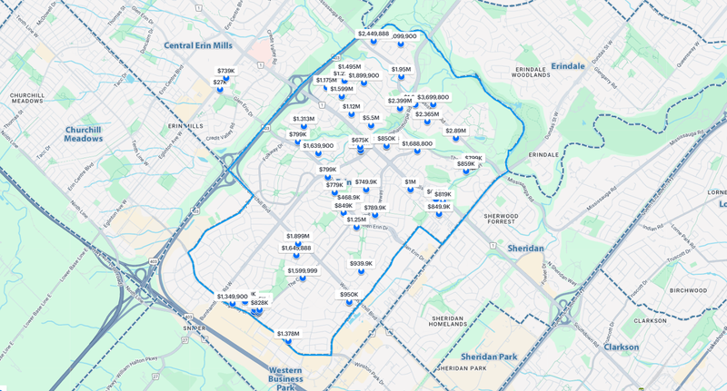 Erin Mills社区以Erin Mills大街为界,分为东部和西部。Erin Mills East通常被称为Sawmill Valley,以Mississauga Road为中轴线。著名的多伦多大学密西沙加分校位于Dundas路北的Credit River西岸。一般来说,中轴线东部的环境和房屋优于西部,因为东部有丘陵和河流,地理条件优越。然而,现在西部也有不少价值250万的豪宅。